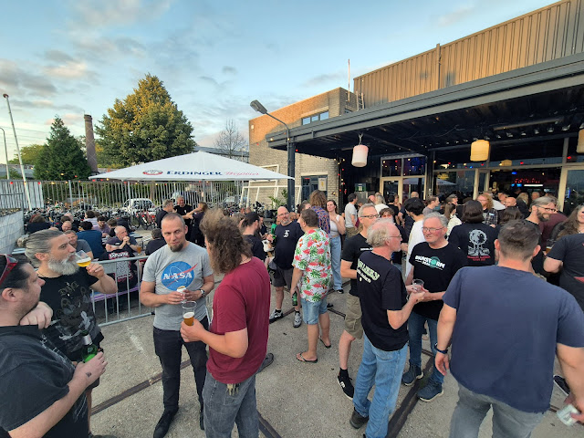 Op de fiets naar DB's, het was prachtig weer en ook op de terugweg naar huis en na twaalven is de temperatuur niet onder de 18 graden gekomen. Ik had afgesproken met Hans, Tom en André en nadat ik het gezellige terras opliep trof ik alleen maar vrienden, vriendinnen en bekenden. Zo waren Saskia, Argo, Patrick, Joran met vriendin er, Tiske, Carolien, Martijn, Paul, Liza, Marlous, Koert, Marc en Rens en dan zal ik er vast nog wel een aantal vergeten zijn. Het was zo gezellig op het terras dat we "geroepen" moesten worden door één van de vrijwilligers van DB's met een rinkelende tamboerijn. Dit gebeurde in de pauze tussen de support en de hoofdact nog een keer, hilarisch. Met André erbij weet je zeker dat je aan bier niks tekort komt dus werd het ook op dat gebied een dolle avond. Maar dat kwam ook zeker door de bands, want de support band Sons of Node zette meteen de toon van deze avond. De band heeft een innige band met The Midnight Ghost Train, al was het maar omdat gitarist Chuy de gitaar van TMGT frontman Steve Moss gekocht heeft. Sons of Node heeft nieuw materiaal, nog steeds straffe stoner met een hard metalen randje. Het wordt een leuk optreden, de band speelt met veel inzet en de zweetdruppels vliegen in het rond. Sommige nummers zijn snel en sommige langzamer met zware riffs, zanger Steve Moss van The Midnight Ghost Train komt ook nog twee nummertjes meedoen. Leuke support en een prima opwarmer, de band heeft vast en zeker nieuwe fans geworven vanavond.
