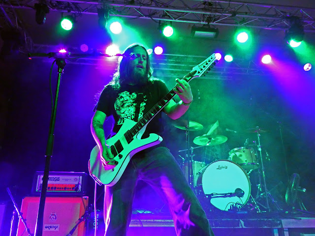 Het was vanavond op een haar na uitverkocht, dat verdient deze band zeker. Meteen vanaf de start zat de vaart er goed in en was er een lekker sfeertje in de zaal. Jammer genoeg werden mijn lievelingsnummers "Gladstone" en "BC Trucker" niet gespeeld. Maar goed, de band ramde er flink op los en is vooral live een hele belevenis. TMGT komt in ieder geval in zo'n kleine zaal beter tot zijn recht dan in de grote Metaldome van Graspop waar ik ze in 2016 op een enorm podium heb zien optreden. Het publiek deed lekker mee en er ontstond diverse keren een kleine pit. De nieuwere nummers die gespeeld worden (van het laatste album "Cypress Ave." uit 2017) zijn wat gevarieerder en de stoner invloeden zijn wat subtieler verpakt in de nummers. Het was een intens optreden en het is ontzettend leuk om al die expressie te zien van zanger/gitarist Steve Moss. De man was na enkele nummers al drijfnat van het zweet. Maar ook drummer Brandon Burghart gaat tekeer als een beest en de van de Sons of Node "geleende" bassist Chut Smit springt rond als een Mexicaanse springboon en neemt regelmatig poses aan met Steve. Na ruim een uur zat het er op, met een soort acapella nummer They're Burying Me Alive werd de avond afgesloten en moesten we met z'n allen meezingen. Heel bijzonder einde in ieder geval van toch wel een bijzondere, vooral live, band. Toch jammer dat het er nu op zit, voor mij blijft The Midnight Ghost Train één van de meest ondergewaardeerde live-acts in hun genre. Helaas blijft foto's maken in DB's net als in de oude lastig door het weinige licht. Na afloop nog een tijdje hele leuke en interessante gesprekken gehad met de diverse vriendjes en dinnetjes en toen was het tijd om naar huis te gaan, deze keer zonder het gerinkel van de tamboerijn.
